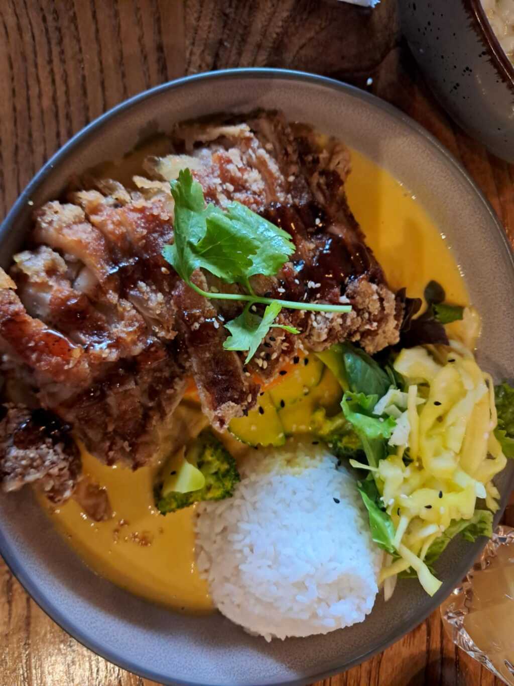 Fruchtige Mangosauce mit frischem Gemüse und Paprika, serviert mit Duftreis, Koriander, Sesam, Fischsauce und Salat mit gebackener Ente.