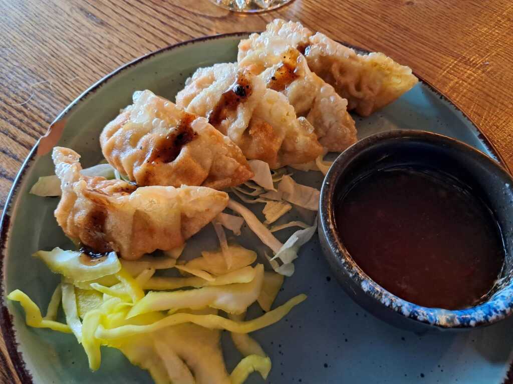 Japanische gebratene Teigtaschen, serviert mit Teriyaki-Sauce. Wahlweise gefüllt mit Hähnchenfleisch.