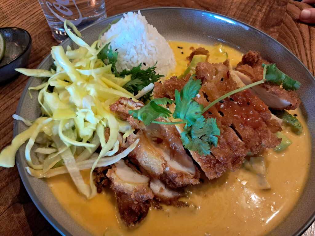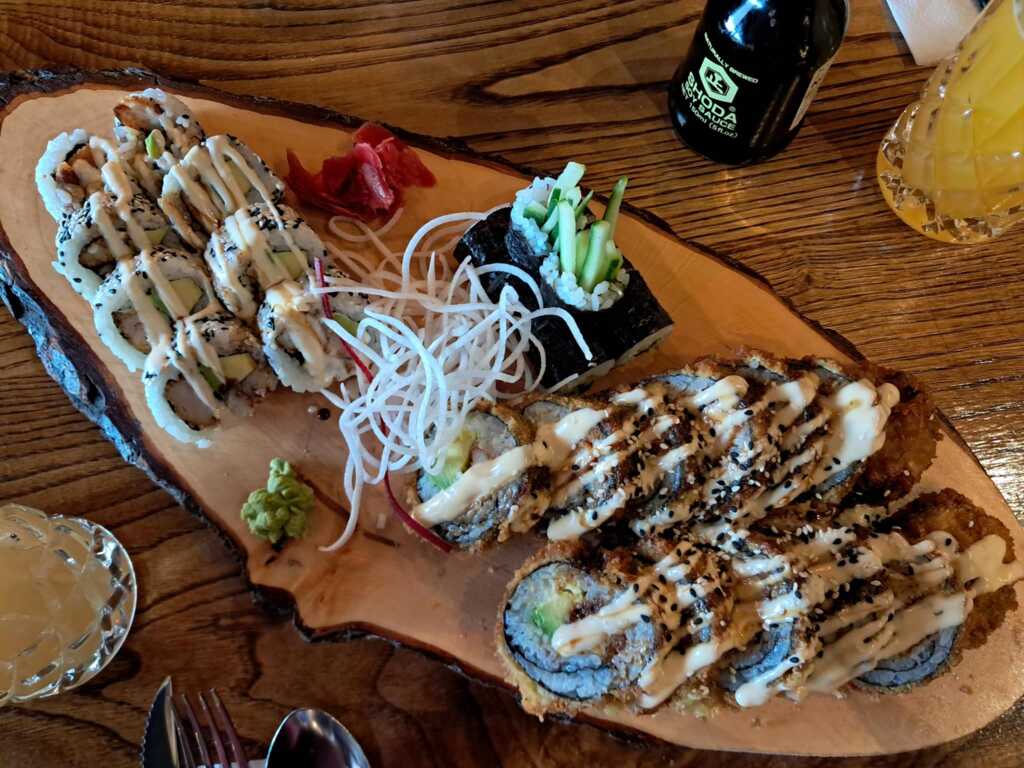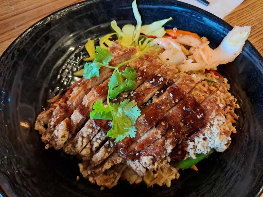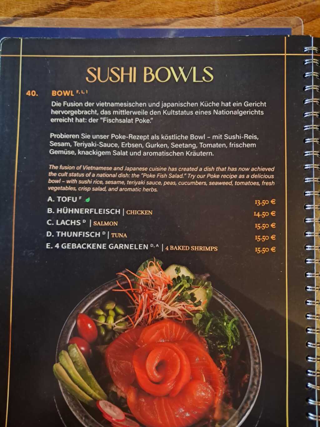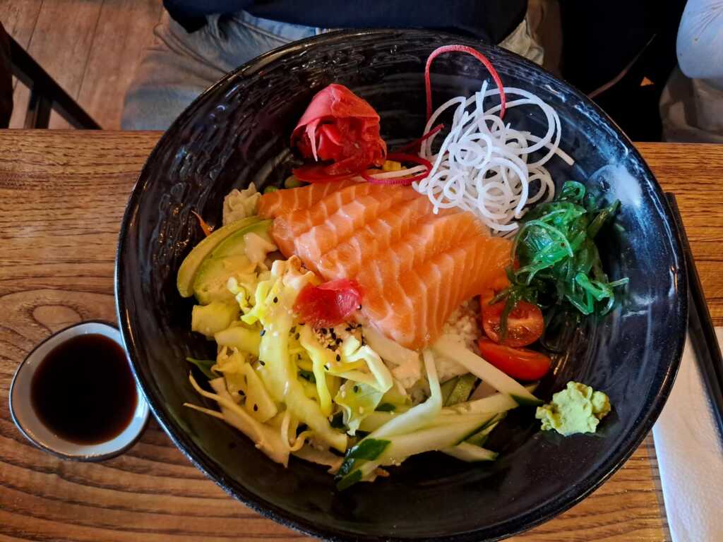 Vietnamesische Küche und Sushi – die Karte ist nach den Grundsaucen etc. aufgebaut und dann kann man Huhn, Ente, Fisch, vegetarisch, vegan ergänzen. Jedenfalls hatten wir (teilweise) Mühe, die Zusammenhänge zu verstehen. Aber wir waren stets bemüht.