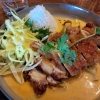Fruchtige Mangosauce mit frischem Gemüse und Paprika, serviert mit Duftreis, Koriander, Sesam, Fischsauce und Salat mit gebratenem Huhn.