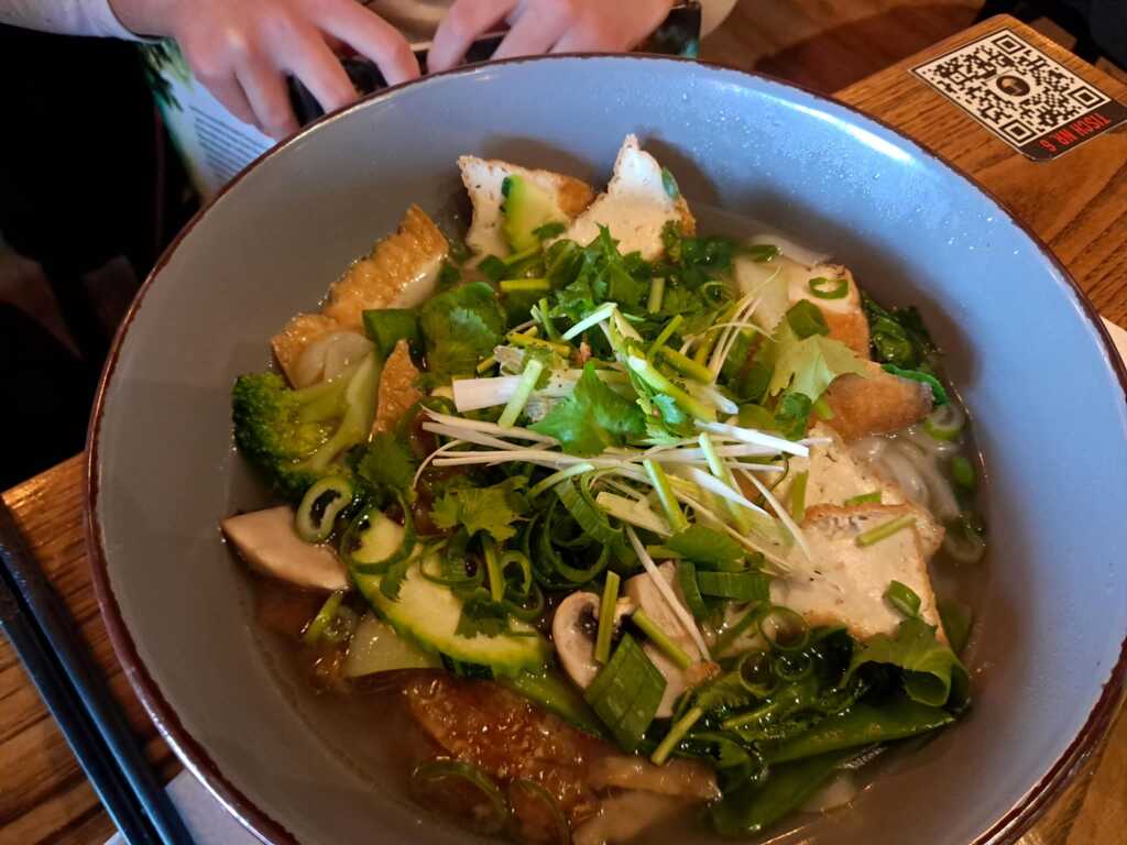 Die Suppe probierte das vegetarische Kind, weil sie Ramen sehr gerne mag. Aber ihr schmeckte die vietnamesische Zusammenstellung nicht besonders. Auch andere Teilnehmerinnen unsere Runde fanden sie gewöhnungsbedürftig.