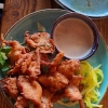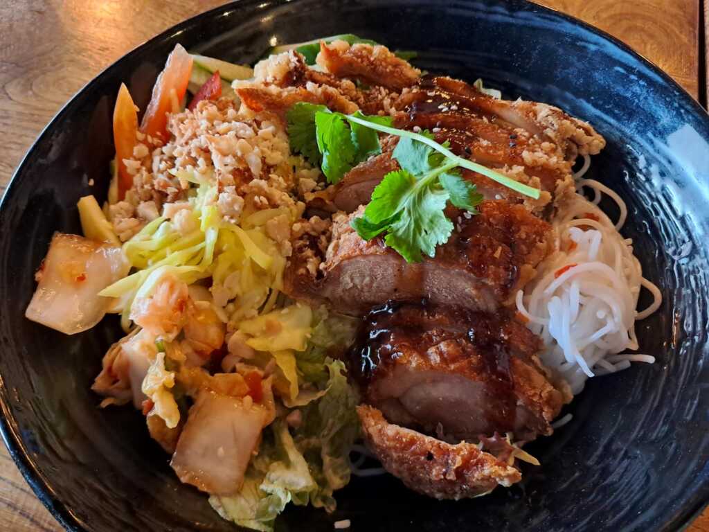 Reisnudeln mit Salat, asiatischen Kräutern und gerösteten Erdnüssen, dazu gebackene Ente.
