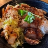 Gebratener Eierreis mit verschiedenem Gemüse, Paprika, Möhren, Sojasprossen, Eiern, Gurken, Röstzwiebeln, Sesam, Koriander, Kimchi, dunkle Austern-Sojasauce, Fischsauce. Wahlweise mit gebackener Ente.