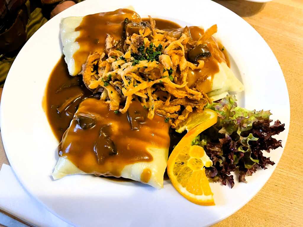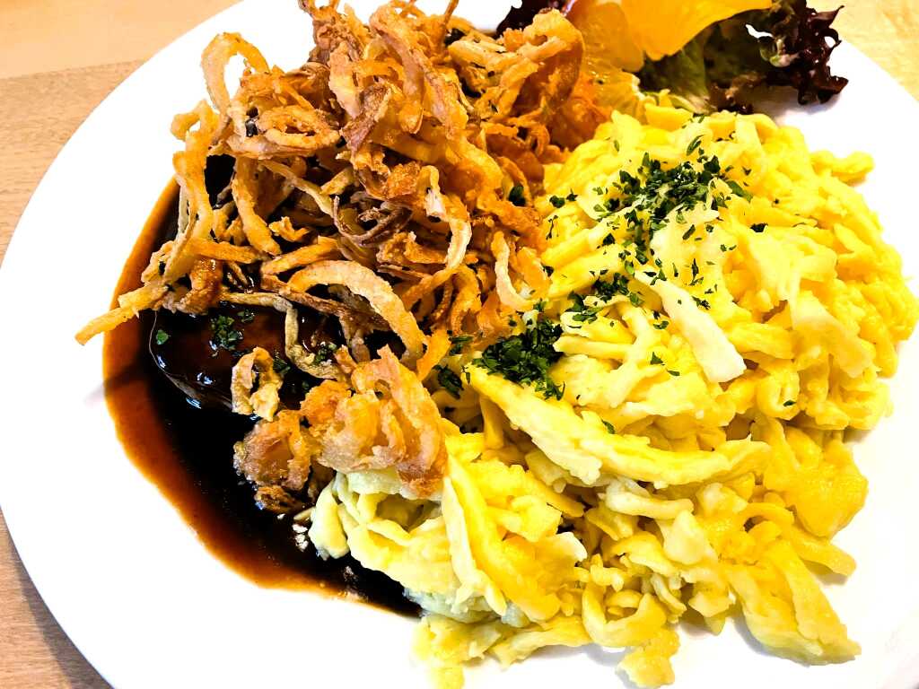 Unsere gewählten Mittagsspeisen überzeugen erst mal durch gehaltvolle Üppigkeit und Qualität. Der Zwiebelrostbraten vom argentinischen Rind wird etwas mehr als Medium serviert, was aber gut so ist. Bei den hausgemachten Spätzle hat man sichtlich nicht an Eiern gespart, so kräftig goldgelb kommen sie daher. Und die mit würzigem Brät gefüllten Maultaschen (drei Stück pro Portion) baden in einer herzhaft-deftigen Rahmsauce mit frischen Champignons. Auch die krossen Röstzwiebeln sind der Hit. Allein der Beilagensalat enttäuscht auf den ersten Blick. Doch dann verbergen sich unter dem schnöden Salatblatt noch reichlich fein geraspelter Möhren- und Rettichsalat, leider kein Kartoffelsalat (den wir uns hier aber sehr sämig vorgestellt hätten).
