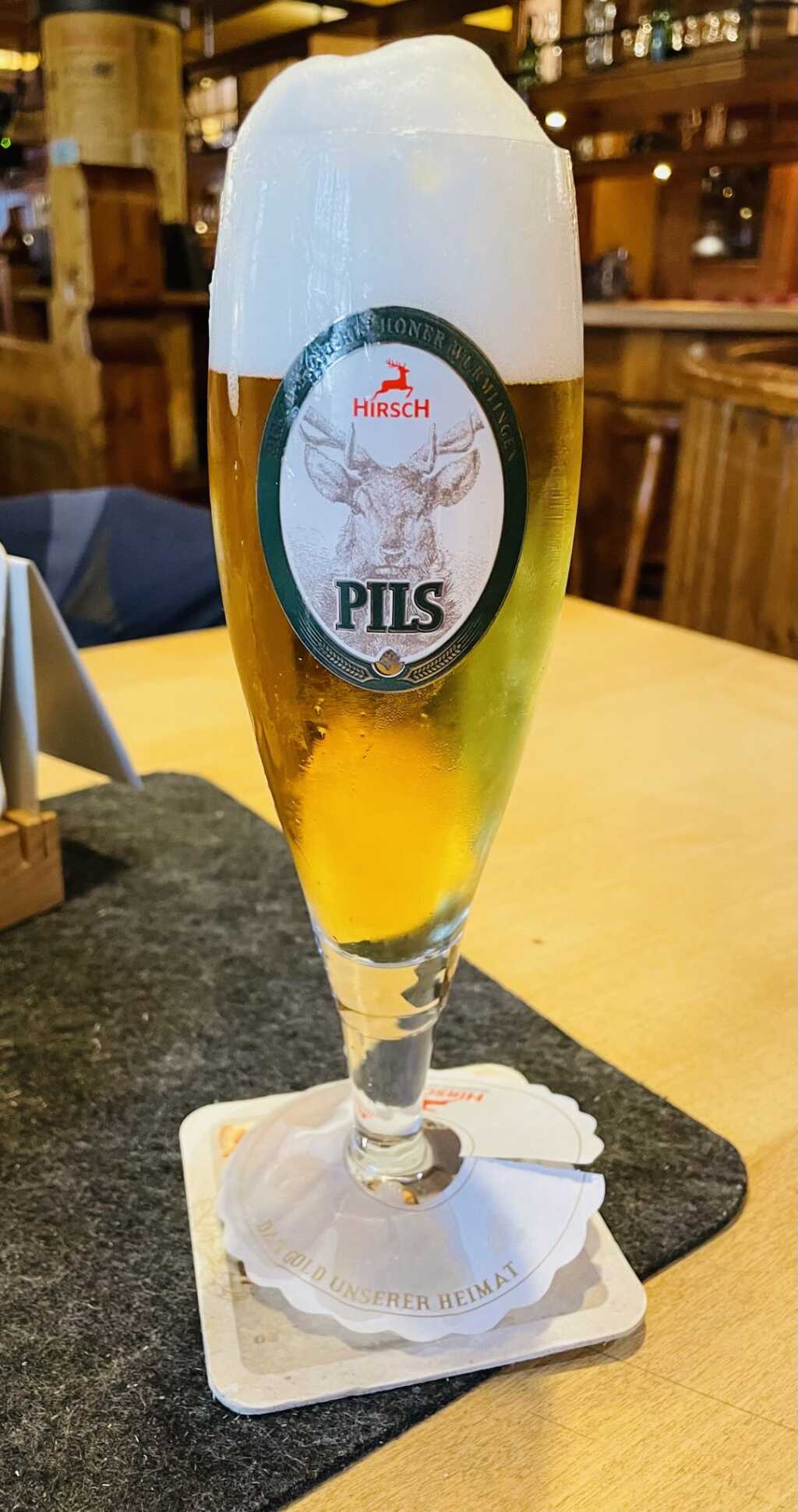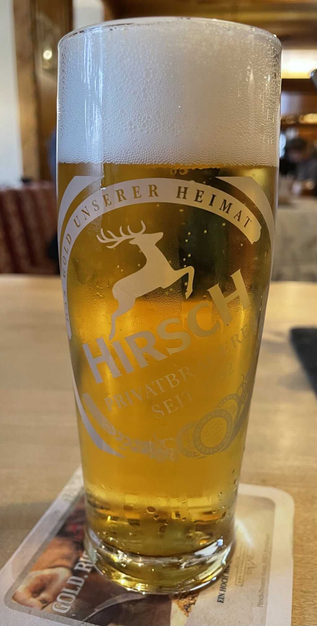 Ein Blick auf die Karte verheisst beste gutbürgerliche Küche. Wir haben die Auswahl zwischen drei (vermutlich preisreduzierten) Speisen aus der aktuellen Mittagskarte oder dem kompletten Angebot aus der grossen Karte. So wählen wir einmal das günstigste und einmal das teuerste Gericht, was dann von Geschmack, Qualität und Optik gar nicht mal so weit auseinander liegt. Hier die Maultaschen mit Salat von der Mittagskarte (15,80 Euro) – dort der Zwiebelrostbraten mit Spätzle und Salat für 33,80 Euro. Die Servicedame, die heute den ganzen Laden wuppt, ist sichtlich vom Fach und weiss auch, was sie tut. Sie klärt uns über die 17 (!) verschiedenen Biere (einschliesslich den alkoholfreien) im Ausschank auf und serviert dann das best gezapfteste Pils (3,90 Euro), das uns je untergekommen ist. Dabei bleibt es natürlich nicht, denn wir testen noch das Zwickl (0,5 Liter für 4,60 Euro), sowie das Hirsch Gold in 0,5 Liter (4,60 Euro) und 0,3 Liter (3,90 Euro) an. Gerne hätten wir noch mehr probiert, wenn eine Zwischenübernachtung eingeplant gewesen wäre. Aber das liesse sich wohl beim nächsten Mal arrangieren.